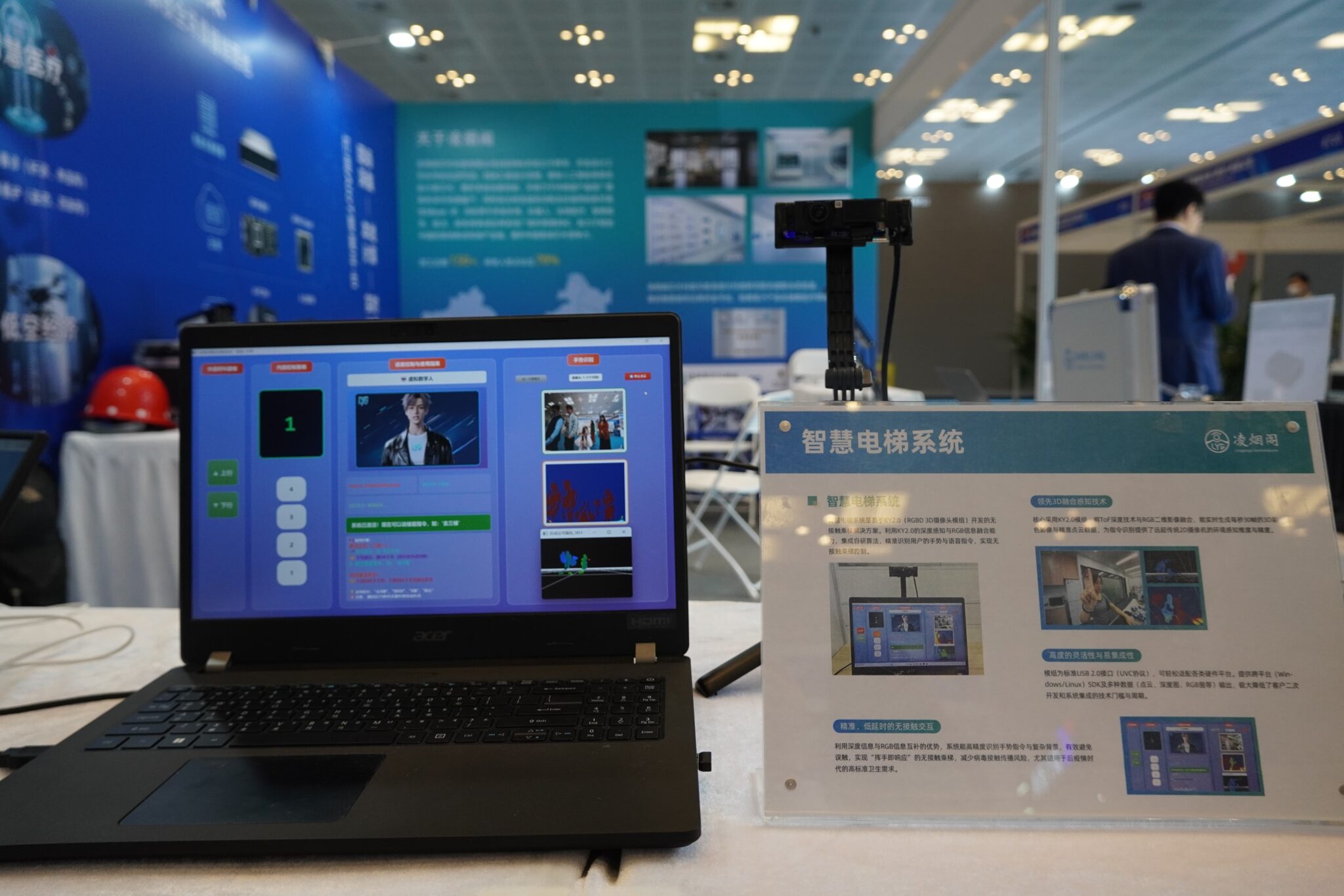 智能电梯系统基于 RGB-D摄像头模组开发,通过深度感知与 RGB 信息融合,精准识别手势与语音指令,实现“无接触乘梯”,有效降低公共场景交叉感染风险;情绪机器人则依托凌烟阁边缘计算服务器本地部署的 LLM 服务,结合语音交互与表情反馈,可实时识别用户情绪并作出拟人化响应,目前已在养老陪护、服务咨询等场景开展试点,展现出高适应性与实时处理能力。