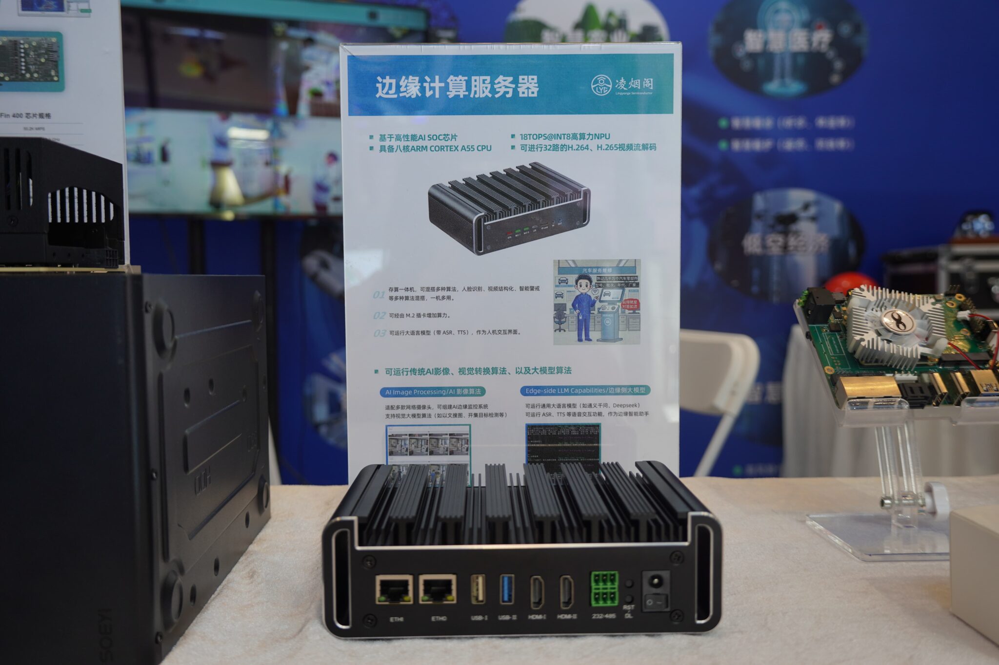 在展品矩阵中,边缘计算服务器凭借硬核性能成为现场亮点。该产品搭载凌烟阁高性能 AI SOC 芯片 AX650N,配备八核 ARM Cortex A55 CPU 与 18 TOPs@INT8 算力,可实时 AI 解析 32 路视频流,支持人脸识别、人形侦测等多算法混搭,同时提供8GB DDR+8GB eMMC和16GB DDR+32GB eMMC两种存储配置,接口丰富度适配多行业需求,更可本地运行千问等大语言模型及多模态模型,目前已在智慧巡检、工业质检等场景实现规模化应用。