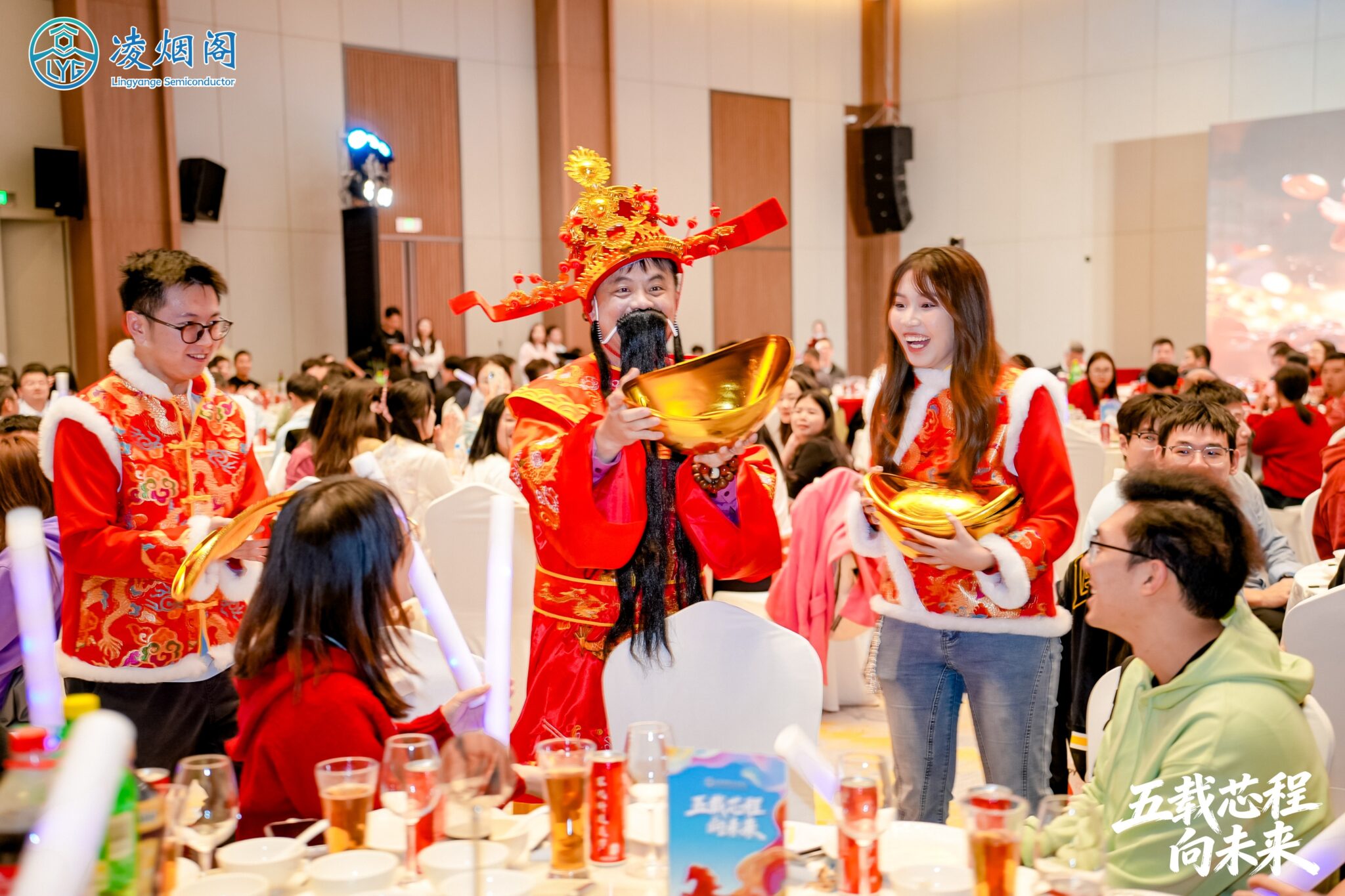 夜幕降临,年会盛典如期而至,执行长李宏俊化身“财神爷”,带着“金童玉女”为在场的嘉宾、员工送上新年糖果,让大家沾沾“财气”。嘉宾员工纷纷打卡拍照,定格这幸福的时刻。